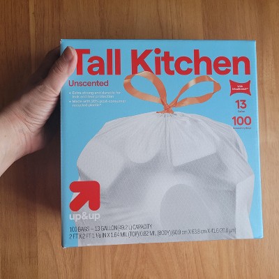 These Unscented FlexGuard Tall Kitchen Drawstring Trash Bags from up & up™ offer an easy everyday option to meet your household tidying needs. These tall kitchen trash bags have a 13-gallon capacity and an extra strong and durable design to help protect against leaks and tears. UltraStretch flexible construction and a reinforced top make for easier filling and carrying, while a gripping drawstring closure lets you securely tie off the top of the bag before taking out the trash.