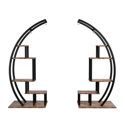 Specifications Material: Powder-Coated Steel Frame, MDF Shelves Colors: Brown & Black (2 stands) Height: 56.1 inches per stand Features: 5 Tiers, 6 Hangers, Half-Moon Design Best Use: Indoor, Covered Patio, Balcony