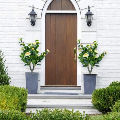 2 Pack Artificial Camellia Tree with Ground Spike, UV Resistant Faux Topiary Tree with Flowers, Fake Flower Plant for Indoor Outdoor Front Door Decor