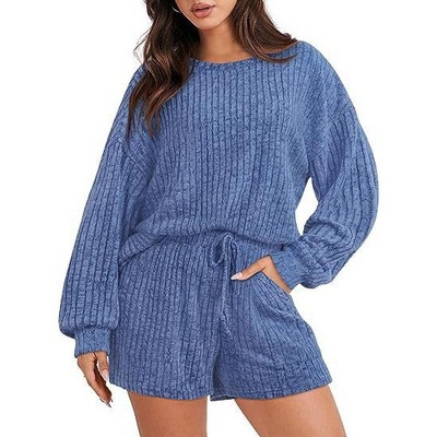 Women's 2-Pieces Loungewear Set Hooded Textured Long Sleeve Top & Shorts Casual Pajama Set Blue L