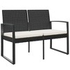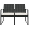 - This 2-Seater Garden Bench with Cushions blends style and comfort, perfect for outdoor spots like gardens, patios, and terraces. Its sleek black frame, paired with soft cushions, gives off a modern feel, enhancing any outdoor setup and perfect for kicking back or socializing. Comfy Cushions: Made with thick, soft cushions to give you great seating comfort, this bench lets you enjoy long outdoor hours comfortably. The zip closure on the cushion covers makes it easy to take off and clean, keeping it looking fresh without hassle. Sturdy Material: Built from powder-coated steel and polypropylene, this bench has a solid structure supporting up to 242.5 lbs. The tough design withstands the elements, so your bench will hold up beautifully outside for ages. Trendy Design: With a contemporary industrial style, the striking black powder-coated frame adds a stylish flair to your outdoor decor. Its sleek look fits well with various settings, from rustic gardens to modern patios. Easy to Keep Clean: The materials aren¡¯t just durable; they¡¯re easy to tidy up too. Follow simple upkeep instructions and you can just wipe down the surfaces with a damp cloth to keep it looking fresh, preserving your outdoor investment through many summers. Ample Storage: The design also offers practical touches like extra storage space under the seat for stashing cushions or garden tools, helping you keep everything neat and organized while you enjoy the outdoors. Color: Black Shape: RectangularMaterial: Synthetic PolypropyleneFinish: Powder-Coated Indoor/Outdoor: Outdoor OnlyCover Included: NoCapacity: Maximum for two peopleMaximum Number of People: 2Maximum Weit: 242.5 lbsDimensions: 40.7 x 40.7 x 30.5 in. (W x L x H)Leg Height: 13.4 in.Weight: 17.81 lbsSeat Depth: 20.7 in.Seating Capacity: 2Swings: NoDelivery Contains: 1 x Bench, 2 x CushionAssembly Required: YesRecommended Number of People for Assembly: 1