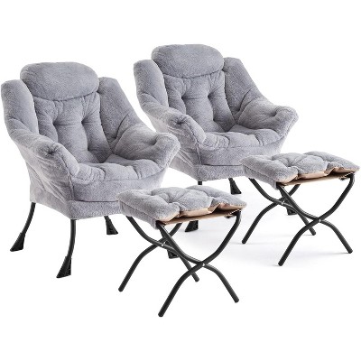 2 Set Lazy Chair with Ottoman, Modern Lounge Accent Chair, Leisure Sofa Armchair with Footrest, Reading Armchair with Side Pocket, Plush Beige