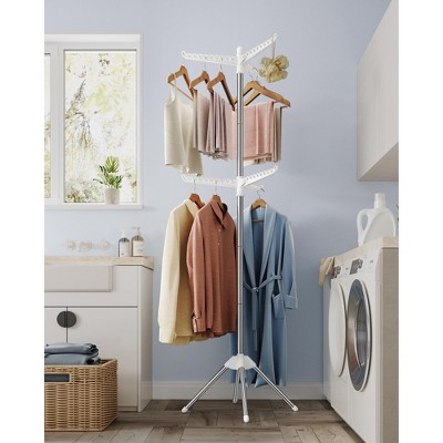Upgrade your laundry routine with this 2-tier foldable drying rack, designed for maximized space efficiency and heavy-duty performance. Featuring 6 fully rotatable arms with 54 hanger slots, it effortlessly dries multiple garments while fitting snugly in small apartments, balconies, or RVs. The ultra-compact foldable design (collapses to just 1.9¡± wide) ensures easy storage, while the sturdy stainless steel frame and 4-leg base provide superior stability, supporting up to 33 lbs. Perfect for travel, camping, or daily use¡ªsets up in seconds and moves anywhere hassle-free! Material: Stainless Steel, Plastic Product Size: 23.6"D x 23.6"W x 75.2"H (60 x 60 x 191 cm) Folded Size: 1.9"D x 1.9"W x 87.4"H (4.8 x 4.8 x 222 cm) Product Weight: 2.9 lb (1.3 kg) Max. Static Load Capacity per Top Arm: 4.4 lb (2 kg) Max. Static Load Capacity per Lower Arm: 6.6 lb (3 kg) Max. Static Load Capacity Total: 33 lb (15 kg)
