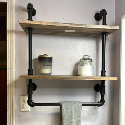 - 2-tier distressed wood finished shelves with a convenient iron piping towel rack for a unique rustic industrial appeal