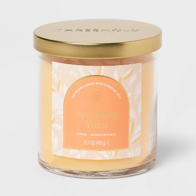 Transform your space with the 15.1oz lavender lemonade jar candle from Threshold. Crafted with a dual wick design, this delightful soy wax blend offers an inviting citrus and fruit aroma that fills the room for up to 50 hours. Housed in a stylish glass container, it's perfect for indoor use, adding a touch of yellow to any decor. Enjoy the comforting glow and soothing scent, creating a cozy atmosphere in any setting.