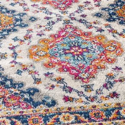 - Combining tones of pink, blue, orange and gold, this rug is a versatile addition to any color scheme
