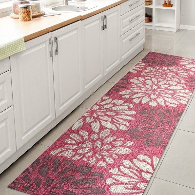 I really loved this rug pattern and the bright magenta color. It’s flat but soft underfoot and seemed high quality. After one month of outdoor use (part sun/shade) it has faded SIGNIFICANTLY, see the photo. The part under my table leg is still vibrant, the rest is very blah. Disappointing.