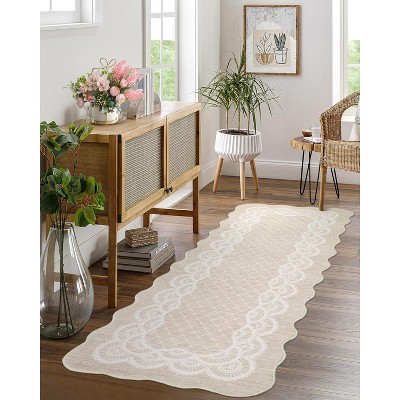 2'x6' Beige Indoor Modern Washable Scalloped Living Room Rugs, Ultra Thin Non Slip Throw Carpet for Bedroom Dining Room Home Office