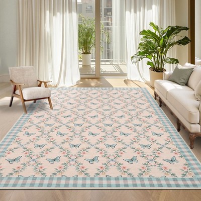 2'x6' Washable Modern Farmhouse Runner Rugs with Butterflies Print, Botanical Low Pile Soft Large Carpet for Home Decor, Blue/Pink