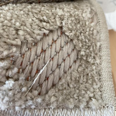 This neutral colored rug has bright orange stitching, as seen in the pictures. It’s not subtle and would definitely show. Returning.