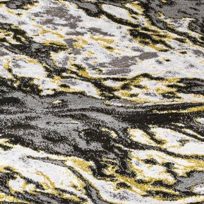 - Deep black and yellow against a soft gray and ivory background gives this rug its abstract, contemporary look