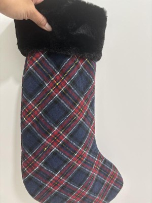 Accentuate your holiday decor with this Plaid Stocking with Fur Cuff from Wondershop™. This Christmas stocking features a plaid pattern for classic flair, along with a faux-fur cuff for a cozy touch. Ideally sized for holding a variety of candies, sweet treats, small gifts and more, the stocking comes with an attached loop for convenient hanging above your fireplace to delight your kids on Christmas morning.