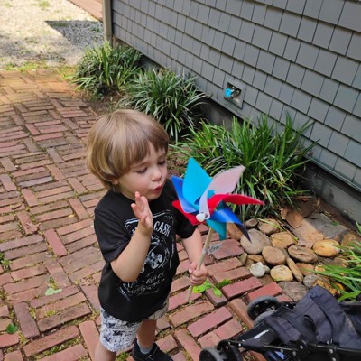 [This review was collected as part of a promotion.] My three year old was instantly drawn to this pin wheel! I wouldn’t say it captivated him for a long time but it’s a classic that brings joy. It could be a great decoration for all summer as well. Thinking I will put it in the yard with last pin wheels I have purchased. Noted the tag was ripped off when I went to do my drive up pick up but otherwise in great condition. Spins super easy too but not flimsy. I received an incentive to write this review.
