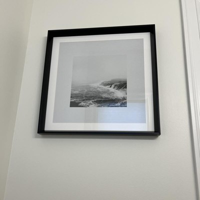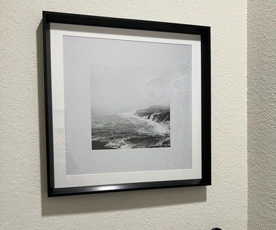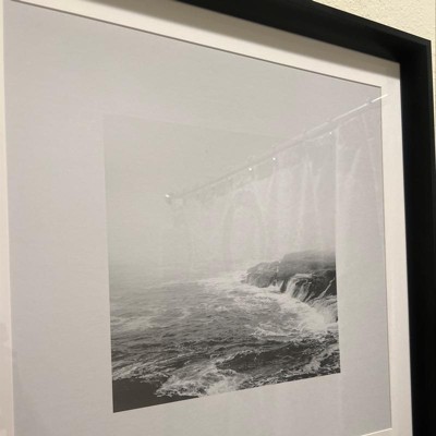 The 20" x 20" Foggy Shore Framed Wall Art by Threshold™ designed with Studio McGee, presents a digital artwork featuring a black and white image of a misty ocean shore. It includes a mat black frame and glass case for a polished appearance. This vertical canvas is versatile, suitable for placement on tabletops or hanging on walls using the saw tooth mount. Immerse yourself in the tranquility of the ocean with this Foggy Shore canvas from Threshold, co-designed with Studio McGee.