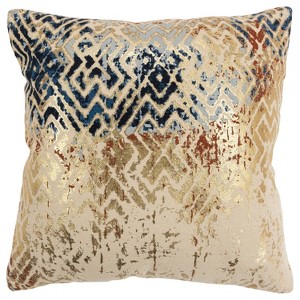 The vivid blue and metallic gold geometric shapes fade out to give this Rizzy Home Beige, Gold, Blue, and Gray Square Throw Pillow a vintage touch for your transitional style home décor. The 100-percent cotton fabric has an overlayed print to give the front a beautiful look, while the back is solid beige with a hidden zipper for easy filling, then the pillow is finished with a knife edge.