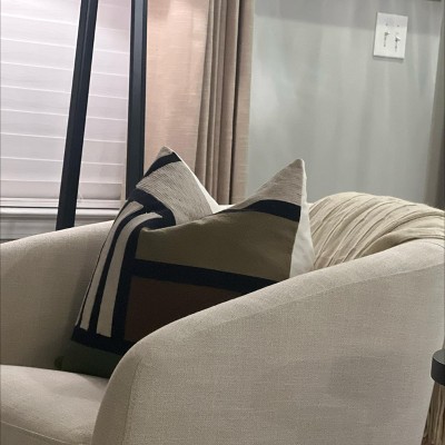 If you're looking for a statement piece to define or elevate a room in your home, this is the pillow cover. This 20" x 20" accent pillow cover from Rizzy Home defines urbane style in an ultramodern presentation of color and sophistication. The unique asymmetrical color block pattern is both contemporary and industrial, while still being refined and elegant. The smooth texture of the pillow cover creates a sleek look that is simply glamorous, alone or layered. The bold color pairing of ivory, black, green, khaki and brown is both versatile and alluring, making it truly avant-garde piece that can stand alone on a chaise, chair or anchor other elements on bedding or family area seating. Whether you are going for an urban or more modern look, this pillow cover is the perfect finishing touch to elevate any innovative living space.