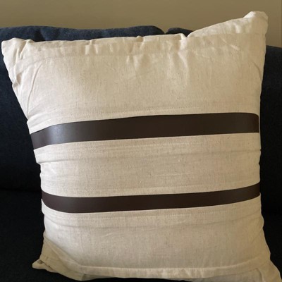 Classy and chic come together on this Rizzy Home Donny Osmond Ivory and Brown Leather Square Striped Throw Pillow, by combining the finest fabric made of 90 percent cotton and 10 percent leather. The pillow has two strips of authentic brown leather that are tucked into the pleats and finished with a knife edge and hidden zipper. This will be a beautiful piece to add to your leather sofa or your favorite chair in the den.