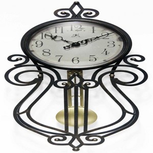 Add sophistication and substance to your indoor living space with the Pendulum decorative indoor wall clock. This clock boasts a weathered wrought iron design that is elegant and refined. The clock itself features a glass lens, wrought iron inspired metal clock hands and a weathered antique-style clock face. The gold-colored pendulum provides welcome style contrast. This clock requires 2 AA batteries (not included) to operate both the time mechanism and the pendulum.