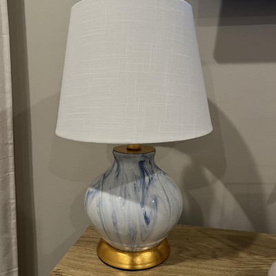 Add style to your home with the designer look of marble recreated in the elegant blue and white glaze of this ceramic table lamp. Artfully painted in a marbleized effect, this lamp is accented with gold leaf accents and a white linen drum shade. At 20.5", it is the perfect proportion for an accent on a side table or buffet.