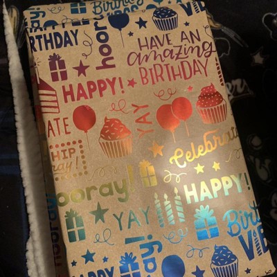 A: The roll wrap features 'happy birthday' messages in rainbow colors.