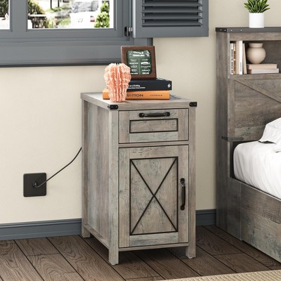 20"W End Table Nightstand Side Table Coffee Table Storage Cabinet Bedside Table with Charging Station, Farmhouse, Rustic, Walnut+Gray-ModernLuxe