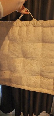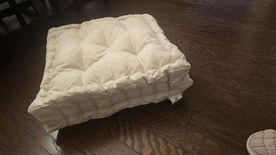 [This review was collected as part of a promotion.] I was excited to get this item because we love to sit on the floor in my house and have pillows just for that reason. So when i received an offer to get it for free in exchange for my honest review i quickly accepted. I thought it would be a bit bigger but although small this thing is incredibly comfortable...it helps take pressure off my low back and is the perfect size for criss cross applesauce. It's basic color almost khaki material so blends in with any decor. When I took it out the packaging I was skeptical but following the instructions for fluffing it helped and it turned into a lovely cushion.
