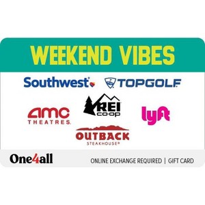 - Exchange this WEEKEND VIBES One4all Favorites Gift Card at redeem.giftcards.com for a choice of eGift(s) to spend at one or more of these brands: AMC Theatres, Lyft, Outback Steakhouse, REI, Southwest Airlines, Topgolf.
