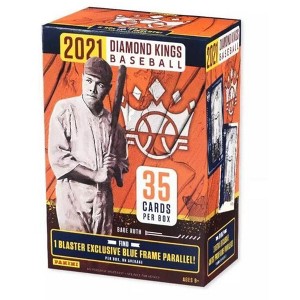 This blaster box includes 2021 Panini Diamond Kings baseball cards with artistic designs. It features rookies and veterans.