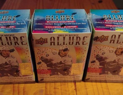 Upper Deck presents the 2023-24 NHL Allure Hockey Trading Card Blaster Box. Each box contains 4 packs with 5 cards per pack. Look for 1 Blaster Exclusive Confetti Base Set Parallel Card per Box! Look for 2 Rookie Cards per Box! Build Color Flow Rainbow Sets! Start with 1 Color Flow Card per Box!