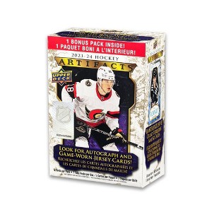 Upper Deck presents the NHL 2023-24 NHL Artifacts Hockey Trading Card Blaster Box. Each box contains 7 packs with 5 cards per pack. Look for Blaster Exclusive Turquoise Base Set Cards. Look for Autograph and Game-Worn Jersey Cards!
