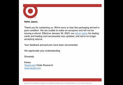 Worst experience ever. I received my package with a visible dent, and it contained a collectible worth over $130. It was clearly damaged during shipping, but Target refused to offer a refund or even store credit. Completely unprofessional. They expect customers to absorb the cost of poor packaging and careless shipping. I will never buy any collectibles from them again.