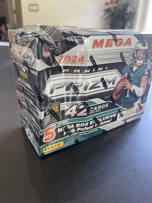 Panini presents the 2024 NFL Prizm Football Trading Card Mega Box. Each box contains 6 packs with 7 cards per pack. Look for Mega Box Exclusive Pink Pulsar Prizms! Look for 1 Memorabilia Card! Find 3 Silver Prizms, per box, on average! Unwrap 10 Rookie Cards, per box, on average! Content may vary.