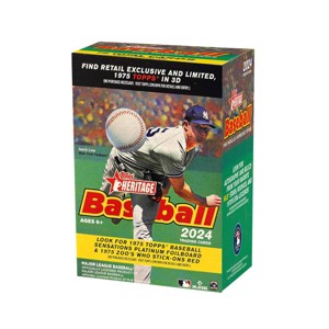 Topps presents Major League Baseball Heritage 2024 Trading Cards. Looks for 1975 Topps Baseball Sensations Platinum Foilboard and 1975 Zoo's who stick-ons red. Find retail exclusive and limited, 1975 Topps in 3D. Look for autographs and relics from your favorite MLB Stars, Rookies and 1970's ERA legends. 72 total cards with 8 packs and 9 cards per pack.