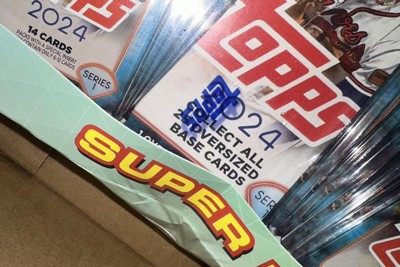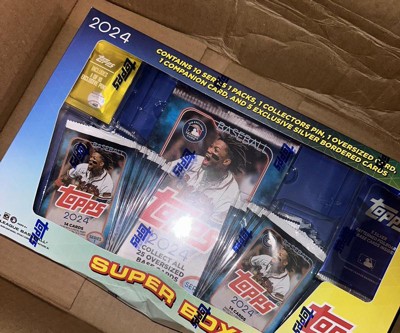 Topps presents the 2024 MLB Series 1 Baseball Trading Card Super Box. Each box contains 10 Series 1 Packs, 1 Collectors Pin, 1 Oversized Card, 1 Companion Card, and 5 Exclusive Silver Borded Cards.