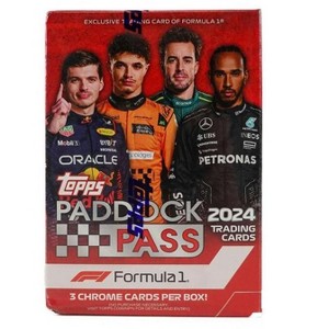 This blaster box contains six packs of Formula 1 cards from the 2024 Paddock Pass series. It highlights current drivers and racing moments.