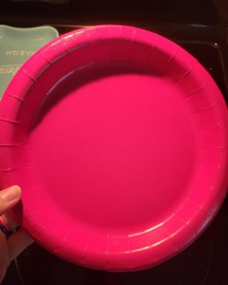 [This review was collected as part of a promotion.] Nice bright hot pink color that my kids very much enjoyed. These plates are surprisingly large and sturdier than I expected. They seem like a good quality. I put noodles with a sauce on it for my daughter and it held up perfectly. I never even thought to double up just in case it fell apart or anything. It is a shame that they do not sell these kind of paper plates in bulk! I received an incentive to write this review.