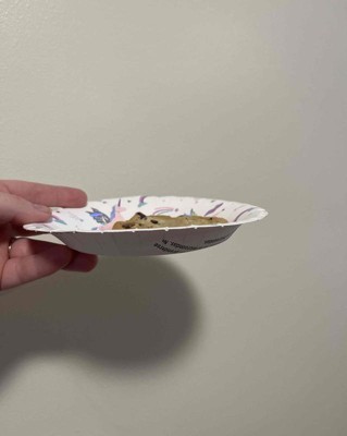 [This review was collected as part of a promotion.] I was surprised that these paper snack plates actually are more shaped like a shallow bowl. The back of these plates also has a message that says the plate is flammable and not to use it in a microwave. The other spritz brand paper plates products did not have this warning , the pattern of unicorns with shiny wings, adorable and one of my child’s favorites. the bowl shape is also very practical compared to the typical flat plate I received an incentive to write this review.