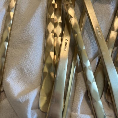A: The flatware set has a textured finish with a PVD coating in a light gold tone.