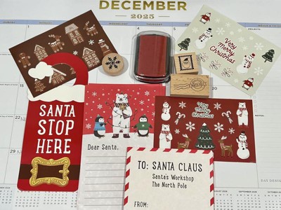 This such an adorable holiday stationary set. It includes everything you can image for writing and sending the perfect letter(s) to Santa. The set includes 6 each of the cute print letter stationary and envelopes along with numerous sticker. I really appreciate that the that the stamps, ink and door hanger can be used from year to year. I look forward to creating Christmas memories with my grandchildren.