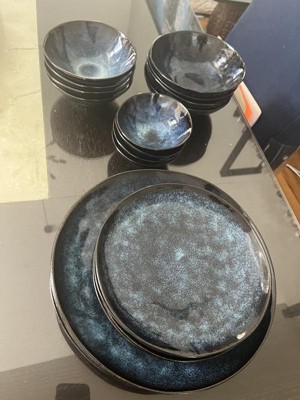 This dinnerware set impresses with its beautiful design and quality, featuring a stunning blue and black color combination that enhances any table setting. Guests appreciate the unique handmade look, sturdy plates, and the variety of bowl sizes that cater to different serving needs. While some have experienced minor chipping, the overall durability and aesthetic appeal make it a worthwhile addition to any kitchen.