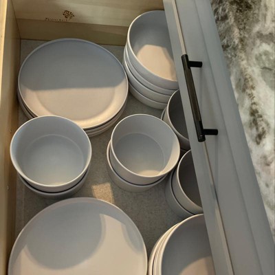 This is a wonderful small set of stoneware. It has a modern design and a matte finish. I purchased 2 sets of these and I wanted a high enough rim to serve spaghetti and other dishes that require a sauce. This stacks well in a cabinet, and with all stoneware it is a bit heavier than porcelain plates. It also fits well in a dishwasher. The dinner plates are an average size and the salad plates are smaller, but would be great to use as luncheon plates. With 2 sizes of bowls, you can serve a robust salad in the larger one and a dessert in the smaller one. The cups are the perfect size for coffee or soup. I was glad we chose this set.