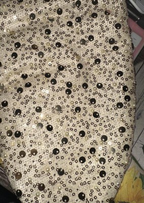 A: The stocking is embellished with allover golden sequins and black and white bead accents.