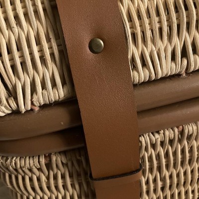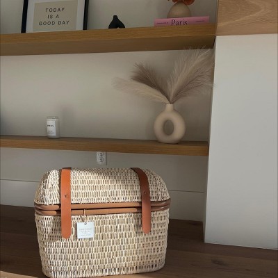 Lend a touch of vintage style to your home decor with the 21-Inch Woven Rattan Storage Trunk from Threshold™ designed with Studio McGee. This brown storage trunk is designed in a natural shade with brown faux leather accents. It's woven with rattan and has a metal frame with flap-like closure, making it great for everyday use. You can use it to stash away pillows, blankets and more.