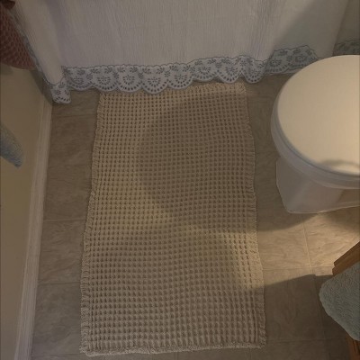 [This review was collected as part of a promotion.] This is the Casaluna waffle cotton bath rug with fringes in color natural, 21” x 34”. This cotton bath rug is great. It has a flat pile To it. I love that it’s machine washable, which is huge in my house! I also like that on the back there’s little grippers that you can’t see if it is flipped over but you can feel it. So the rug stays put. I do recommend this rug!