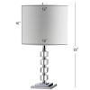 Add sparkle to any room with this contemporary crystal glass table lamp. The body features stacked cubes of clear crystal accented by chrome fittings. This appealing design is topped with a white fabric drum shade. Geometric crystal lamp with a stacked cube design. 100% cotton hardback drum shade. Beautiful to display or easy to conceal: the 60" cord is silk-wrapped. On-off rotary switch on socket. Takes one maximum 60 watt or equivalent bulb (one LED bulb included). Eco-friendly 9W LED bulb included. UL Listed. Before cleaning any lamp shade or fixture, disconnect the power source. Wipe with a soft, dry cloth. Avoid the use of chemicals and household cleaners as they may damage the finish.