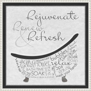 - CUSTOM CANVAS ARTWORK DETAILS: Bath Time I by SD Graphics Studio. DESCRIPTION: In this artwork, an abstract bathtub is composed of motivating bath related words like Soak and Bubbles. The soothing color palette creates a serene and tranquil scene.