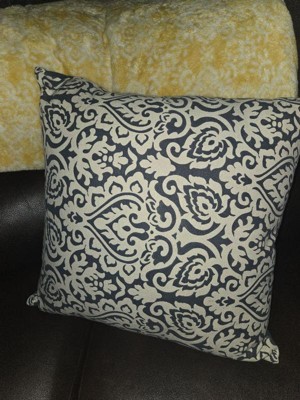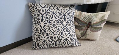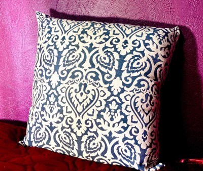 [This review was collected as part of a promotion.] This is a wonderful pillow! Love the damask design on front side, and the solid navy back. The burlap pillow case feels soft yet durable. Zipper is on backside. Like that the case is machine washable. The pillow itself is plump, exactly the right amount of firmness. Very comfortable. Though I am using this pillow indoors, the burlap case should hold up well on a patio as well. A quality pillow offered at a reasonable price point.