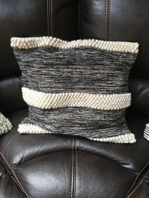 [This review was collected as part of a promotion.] I love this throw pillow cover!! It actually needs a bigger insert than the size of the pillow cover, so with this one I needed about 2 sizes larger than what the actual cover is. Anything less doesn't fill ir out completely, one size up fills it but still leaves enough space so where it looks flat and if you try to set it diagonally, it loses its shape. I also preferred a cotton insert versus feathers just to hold the shape and fill it out completely. It is really beautiful though, the stitching and design is very well made. The zipper is horizontal across the back towards the top of the pillow but is covered nicely. You can set it on either side and it looks really beautiful. The blended color blocks are black and a creamy cotton color with the back being solid creamy cotton. It actually looks beautiful with any modern style, Moroccan style or boho decor. It would also look pretty within a minimalist design for a pop of texture and fun. The pompoms are attached really well and I don't see them being an issue with kids unless they intentionally tried to pull them off. Very well made, thick and surprisingly very comfortable wherever you decide to put it. I have mine on our grey sofa and it looks really cool along with a few other pillows by this brand, in the same style, one with fringe and the other with a weave design, all having the same color scheme.