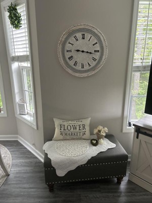 This round wall clock is best displayed with soft hues themed farmhouse decorations. Requires 1 AA battery. Battery not included. This item ships in 1 carton. This clock features a roman numeral clock face with black hands. The clock mechanism runs silent. This item features a wall clock with beads frame. Can be hung vertically using the D-rings on the back; nails and screws not included. Suitable for indoor use only. This item ships fully assembled in one piece. This is a single white colored oversized wall clock. Farmhouse style.