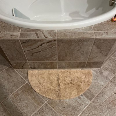 This half round bath rug looks fantastic in front of the tub. The color matches my other coral accessories and the size is just right for my small bathroom. The semicircle shape makes the space look bigger and gives it a designer feel. Constructed of nice soft cotton with professional sewing and tufting.